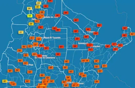 El pico extremo de calor se sentirá en las provincias de Formosa y Chaco con una temperatura máxima de 39 grados, Misiones se presentará con una máxima de 37 y Santiago del Estero con 35. Le siguen Córdoba con una máxima de 34, Santa Fe prevé una máxima de 33, San Juan y Tucumán una máxima de 32 y Salta se ubica en el último lugar de las provincias en alerta con 31 grados.