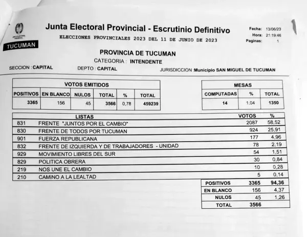 Arrancó el escrutinio definitivo de las elecciones tucumanas, que resolverá el conflicto que se desató en la Capital provincial, donde las dos candidatas a la intendencia aseguran haber ganado las elecciones, pues la diferencia en el escrutinio provisorio fue de 1.999 votos, que representaban 0,66 puntos porcentuales para el Frente de Todos, faltando contabilizar 203 urnas, que son el 15% del total.