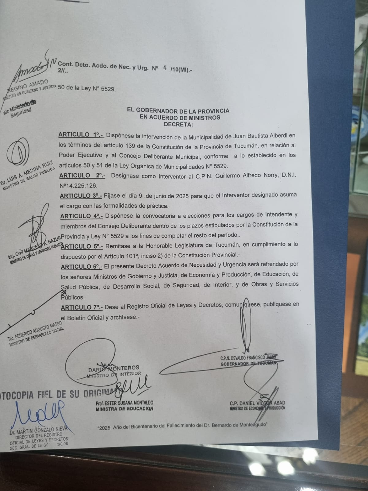 El gobernador Osvaldo Jaldo decidió este lunes mediante un Decreto de Necesidad y Urgencia (DNU) intervenir la ciudad de Juan Bautista Alberdi y designó como normalizador a Guillermo Norry.