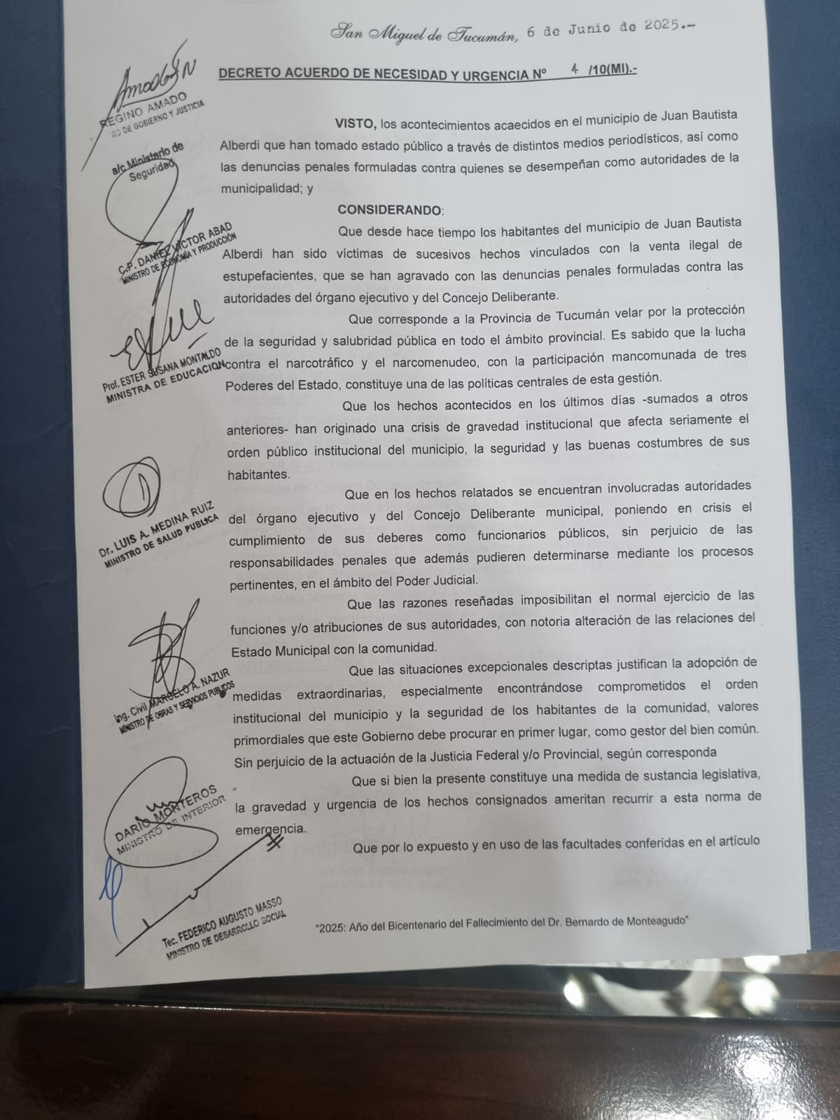La medida se fundamenta en el artículo 139 de la Constitución de Tucumán, que habilita la intervención de gobiernos municipales ante situaciones de grave desorden institucional, y establece un plazo de intervención no mayor a 180 días.