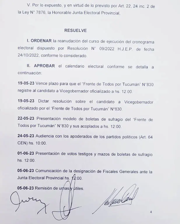 La Junta Electoral, con las firmas de su presidente, Daniel Leiva, y los vocales Washington Navarro y Edmundo Jiménez, emitió la Resolución N° 318 considerando que la sentencia de la Corte Suprema de Justicia de la Nación en autos “Partido por la Justicia Social contra Tucumán, provincia, sobre amparo” levantó la medida cautelar que suspendía las elecciones para los cargos de gobernador y vicegobernador, y que el Decreto N° 1620/1 del Poder Ejecutivo del 16 de mayo de 2023, fijó nueva fecha de las elecciones para al 11 de junio de 2023.