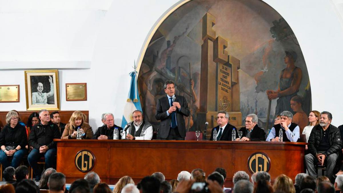 En una visita al histórico edificio de la CGT, Massa aseguró a la dirigencia de esa central obrera que se propone representar “la Argentina de la producción y el trabajo” y planteó que la salida de la crisis pasa por “la venta de trabajo argentino al mundo, que es lo que nos va a sacar adelante”.