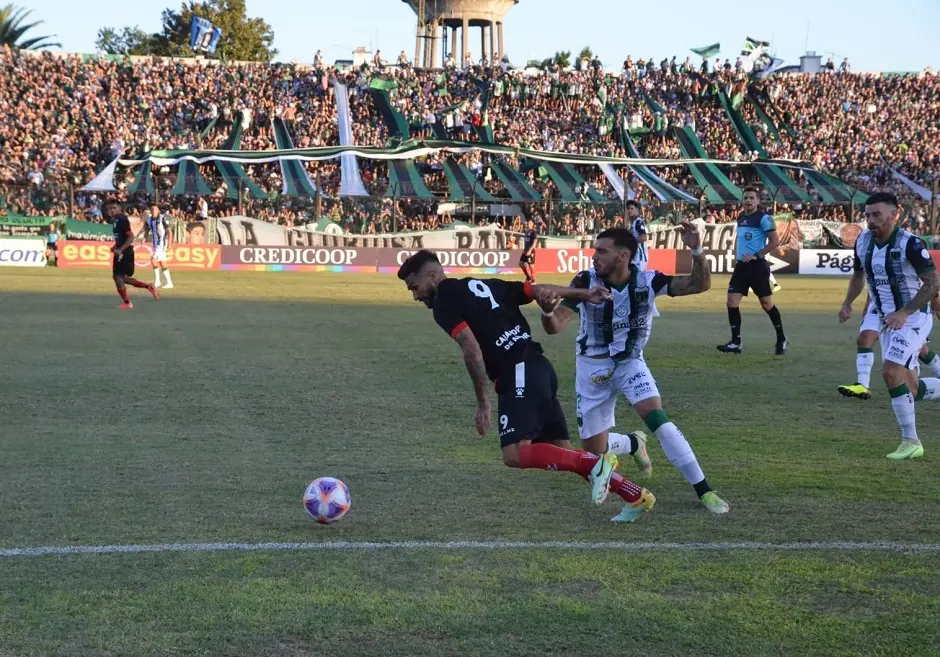 La posesión se mantuvo pareja en los primeros minutos, sin chances claras. A los 32 Claudio Pombo envió un centro cerrado, Emanuel Dening cabeceó, pero la pelota se fue desviada.