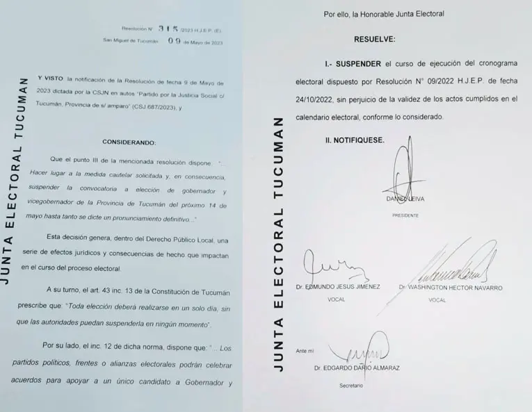“La resolución 315 de la Junta Electoral resuelve suspender el curso de ejecución del curso del cronograma electoral por resolución 9 del 2022 sin perjuicio de la validez de los actos cumplidos en el calendario electoral conforme lo considerado”, expresó.